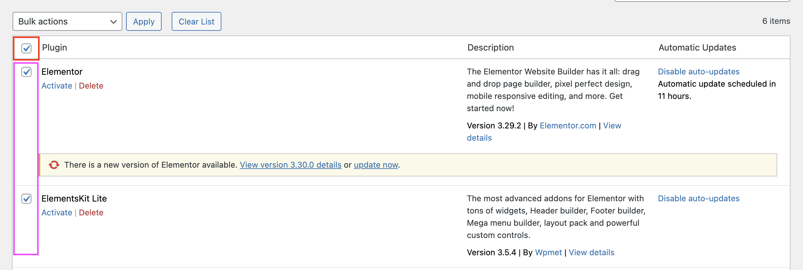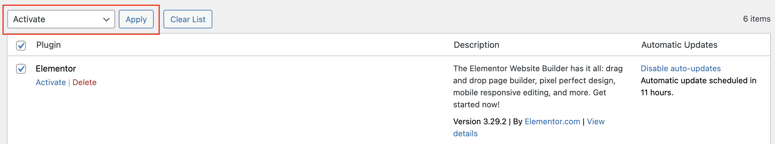 Jika ingin memilih semua plugin di daftar tersebut, centang kotak di bagian atas daftar.
