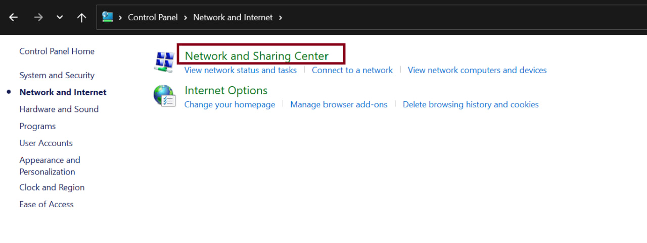 2. Pilih “Network and Internet”, kemudian klik “Network and Sharing Center”.