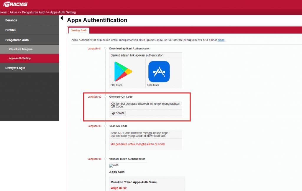 3. Setelah halaman aktivasi muncul, klik tombol ‘generate‘ yang terdapat pada Langkah 02 untuk menampilkan QR Code pada Langkah 03
