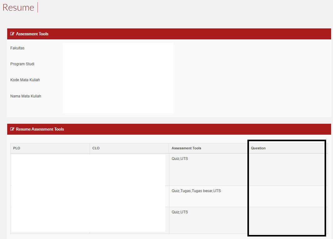 Mohon dipastikan bahwa question pada assessmentools sudah dibuat. Lakukan pengecekan sebagai subject koordinator pada menu Views Course Subject Coordinator » Klik Kelola Tool Assesment – klik tombol lihat resume. Apabila pada kolom Question kosong (seperti screenshot dibawah), maka perlu diisi terlebih dahulu oleh subject coordinator.