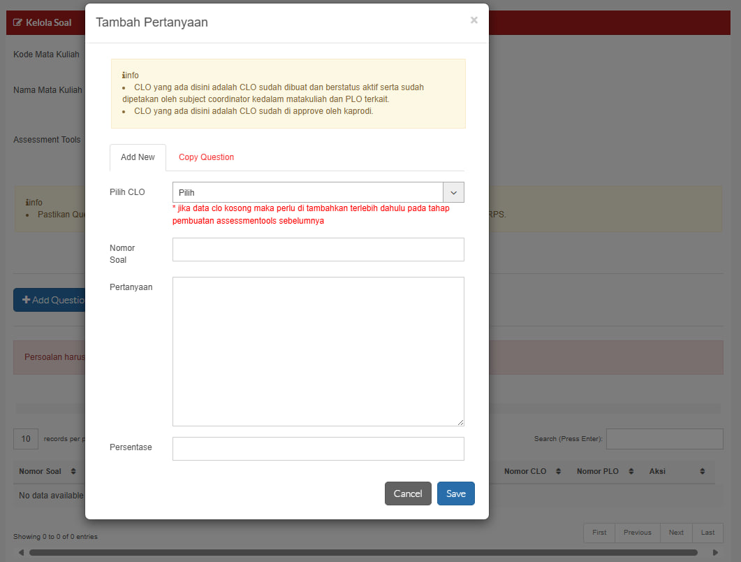 Untuk dapat melakukan copy pada Question Assessment Tool, silakan memilih schoolyear dan semester terlebih dahulu, serta melakukan mapping CLO.