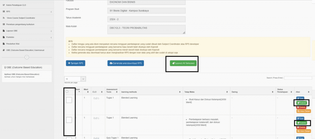 CLO akan muncul apabila sudah dibuat dan berstatus aktif serta sudah dipetakan oleh subject coordinator ke dalam mata kuliah dan PLO terkait. Selain itu, CLO juga harus sudah di-approve oleh Kaprodi.