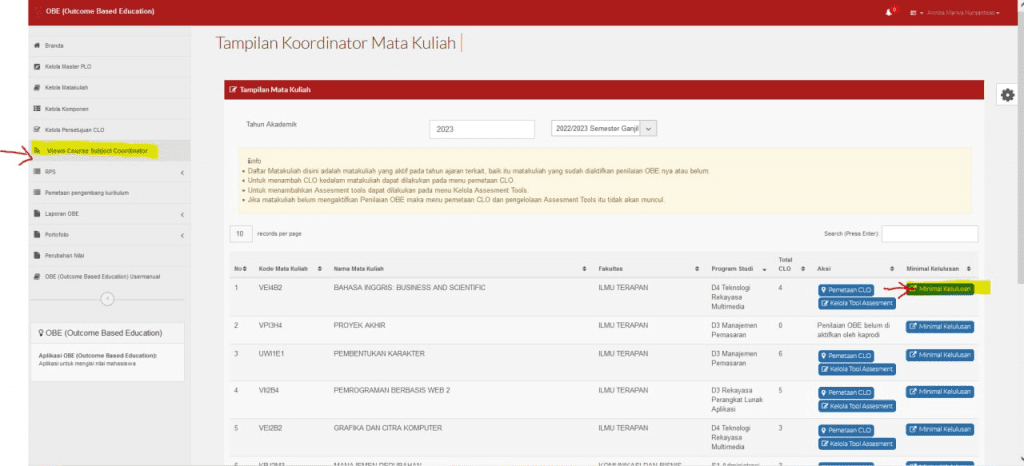 Silakan akses menu View Course Subject Coordinator -> Pilih mata kuliah yang akan di set batas nilai minimumnya -> klik tombol Minimal Kelulusan -> masukan batas minimal kelulusan dan batas kelulusan mahasiswa -> klik simpan