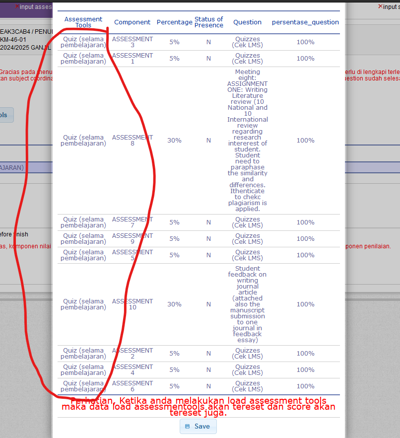 Melengkapi persentase question di manage question pada Aplikasi OBE oleh Dosen Koordinatornya, dan jika dilihat masih terdapat AssesmentTools yang belum termappingkan, mohon untuk diinfokan ke dosen MKU yang menginputkan AssesmentTools.